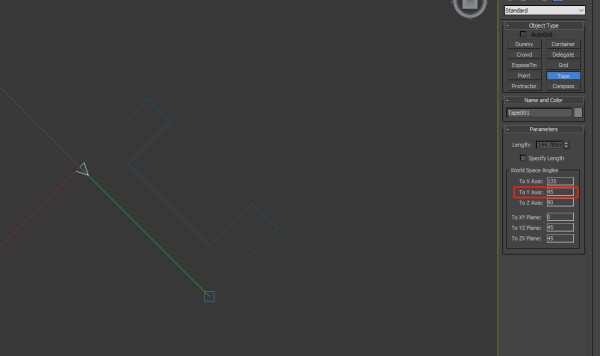 2、按下s打开捕捉,捕捉到需要测量角度的直线的第一个端点点击鼠标,拖动鼠标到第二个端点,新建一个tape001,可以在左侧看到测量到的角度值。