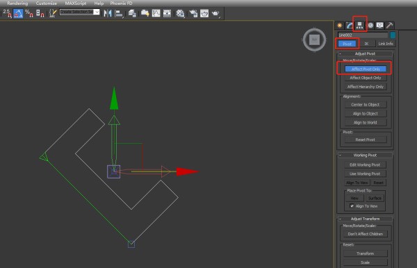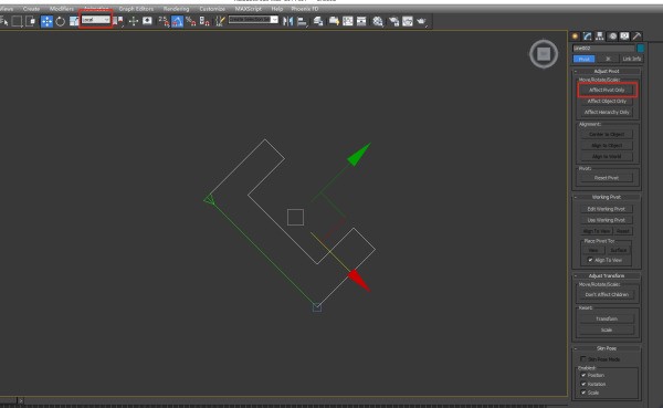 3、选中模型,按下图所示点击Affect Pivot Only,这个按钮的意思是只影响坐标轴,顾名思义就是说此时移动旋转操作都只是在移动旋转坐标轴,模型的位置角度不会受到影响。此时可以看到坐标轴变成了可以编辑的状态。