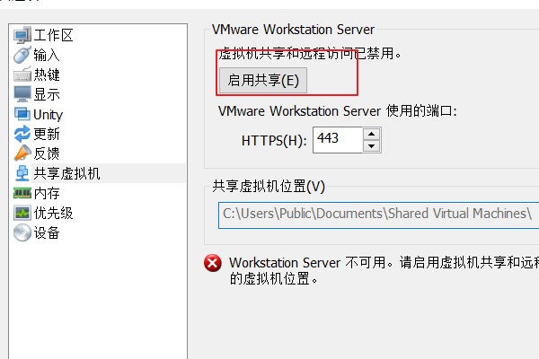 原因:设置错误导致。解决方法:将虚拟机中设置为启用共享来解决此问题。