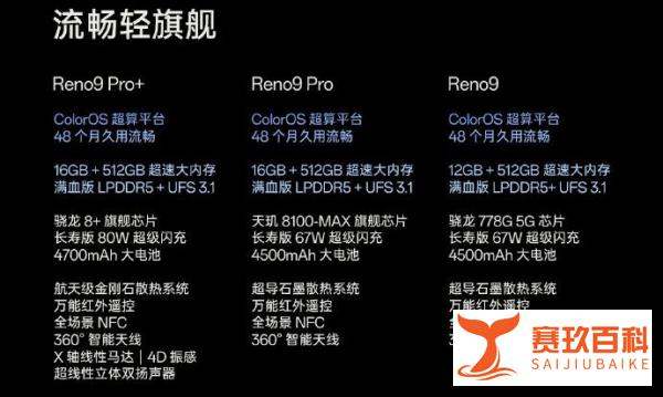 处理器:三款机型分别搭载骁龙778G、天玑8100 - MAX和骁龙8+处理器。其中Reno 9 Pro+搭载的高通骁龙8+芯片采用4nm台积电制程工艺,超大核主频是3.0GHz,性能强劲,能够满足用户对于高性能的需求,无论是日常使用还是运行大型游戏、多任务处理等场景都能轻松应对。