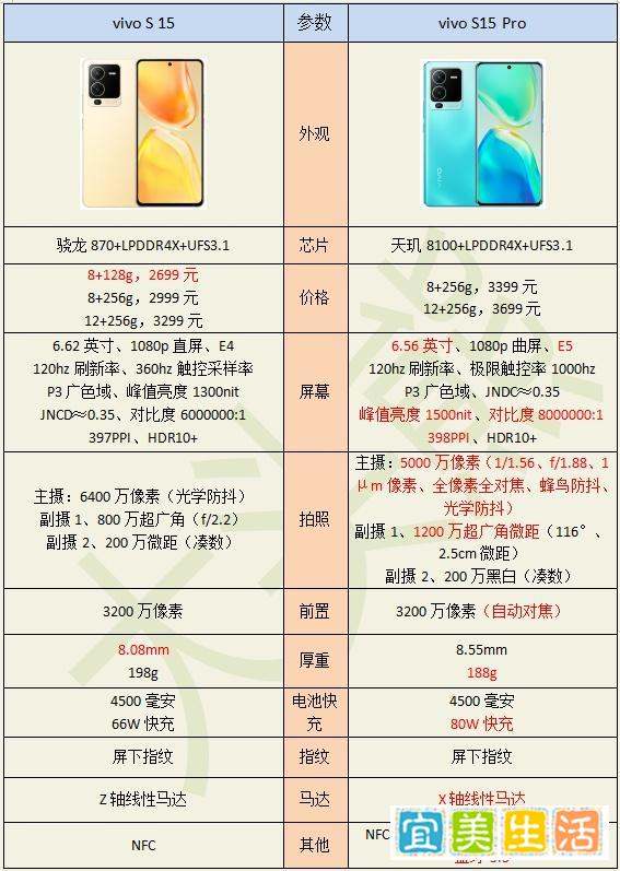 屏幕升级:从90hz屏幕提升到120hz三星E4高素质屏幕,具有超高亮度、高色准表现,色彩细腻度也不错,三星E4屏幕在该价位素质较高。拍照升级:主要升级了光学防抖,像素从1亿像素换成6400万大底镜头。电池和快充升级:电池容量增加300毫安达到4500毫安时,快充从44W升级到66W。马达升级:升级到线性马达。vivo S15 Pro相较于S12 Pro的升级性能升级:芯片由天玑1200升级到天玑8100。天玑8100口碑良好,功耗表现出色,用骁龙865的功耗跑出骁龙888的性能,不会像去年的火龙888那样过分发热。单核CPU性能一般比不上骁龙870,但多核CPU性能直追骁龙888,GPU性能比骁龙888弱一点,但大幅领先于骁龙870,整体性能可圈可点。屏幕升级:从90hz屏幕提升到120hz三星E5高素质屏幕,三星E5屏幕是iQOO9、vivoX80等旗舰标准版的配置,放在3399元的S15 Pro上诚意十足,同样具备超高亮度、高色准表现,色彩细腻度不错。拍照升级:从1亿像素升级到索尼IMX766V大底主摄,与vivoX70Pro同款,还上了超级蜂鸟防抖(主要针对视频录制),影像硬件规格提升非常大。电池和快充升级:电池容量增加200毫安达到4500毫安时,快充从44W升级到双电芯80W,18分钟可充电至70%。马达升级:升级到X轴线性马达。相较于S12系列的降级点设计:设计上套用iQOO Neo6,相比前几代设计中规中矩。自拍:原先用刘海屏保留超广角前置是S系列特色,此次被砍,不过正面观感不错,颜值提升。轻薄手感:重量从178g左右变成190g左右,厚度也有所增加,配置增加后不可避免地走向厚重。另外,vivo S15为金属边框,Pro版本为塑料边框,不过Pro版本因塑料边框更轻。