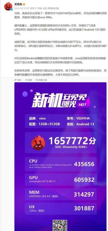 vivo天玑9200+新机型号为V2241HA,疑似命名为X90S,其核心配置和特性如下: