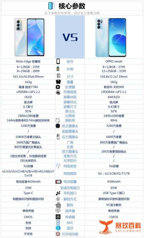 价格优势:Moto Edge 轻奢版(8+128GB版本)售价为2599元,而OPPO Reno6同版本售价为2799元。Moto Edge 轻奢版价格更低,性价比更高。