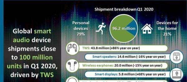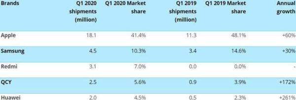 出货量领先:根据知名分析机构Canalys发布的报告,苹果AirPods在该季度的出货量达到了1810万台,稳居市场首位。市场份额优势:苹果AirPods的市场份额超过了三星、Redmi、QCY以及华为等竞争对手的总和,显示出其在智能音频设备市场的强大竞争力。市场地位:这一数据进一步巩固了苹果在智能音频设备领域的领先地位,也反映了消费者对AirPods品牌的认可和信赖。以下是Canalys发布的2020年第一季度全球智能音频设备出货量报告的相关图片:
