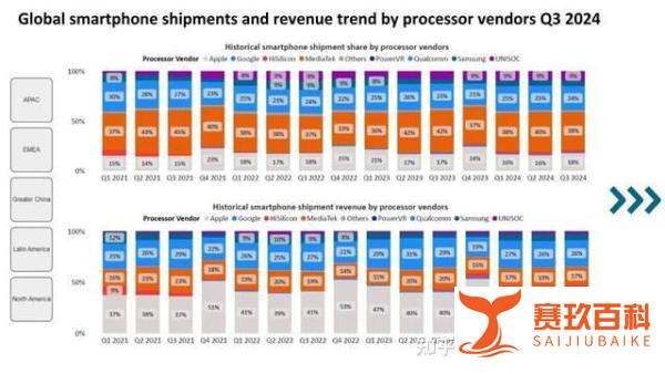 出货量与市场份额:根据Canalys发布的2024年第三季度智能手机处理器厂商竞争格局报告,联发科在该季度保持了智能手机处理器市场的领先地位,排名第一。其搭载处理器的智能手机出货量达到1.193亿台,市场份额高达38%。这已是联发科智能手机处理器出货量连续15个季度保持第一位,充分证明了其在市场中的稳固地位。