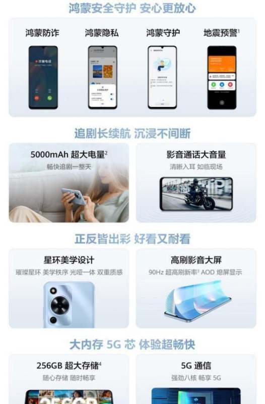 发布时间与定位:9月1日发布,定位入门款5G手机,主打鸿蒙安全守护、256GB超大存储和5000毫安时长续航。