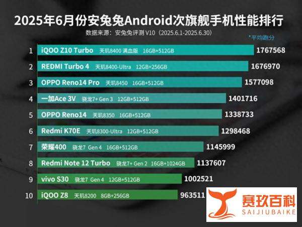 6月份安兔兔安卓次旗舰性能榜中红米Turbo4排名第二,第一名是iQOO Z10 Turbo。以下是具体排名信息及各机型核心亮点: