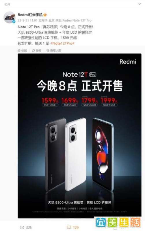 Redmi Note 12T Pro今晚8点正式开售,起售价1599元,搭载天玑8200-Ultra芯片与144Hz LCD护眼屏。以下是该机型的核心配置与特性: