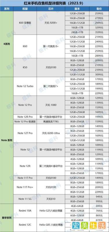一、在售机型芯片与定位梳理红米在售机型共15款,芯片覆盖次旗舰到低端,价格跨度从619元到3599元。芯片分档如下: