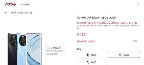 华为畅享70X活力版是一款定位中低端市场、主打性价比的智能手机,起售价1499元,提供128GB、256GB、512GB三种存储版本,支持国补政策,具备大电池、北斗卫星消息等特色功能,适合日常使用及轻度娱乐需求。