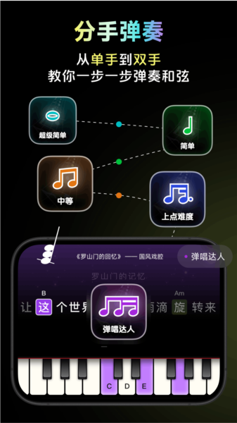 所有的乐曲都可以下载到手机上,这样你随时随地都可以进行弹奏。