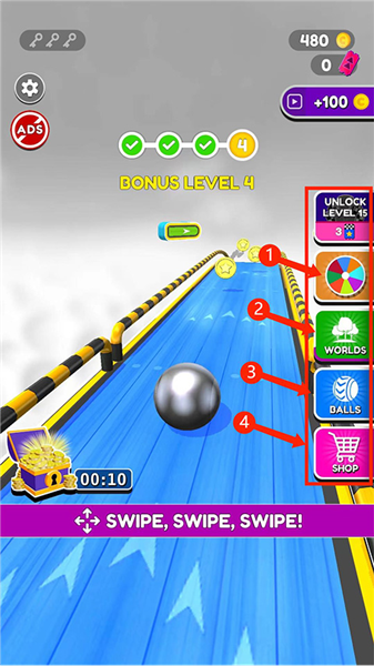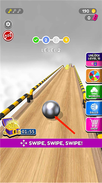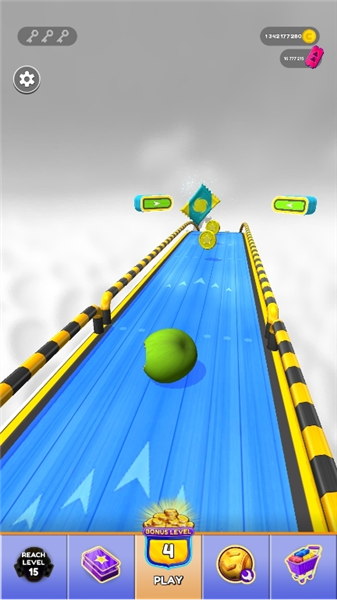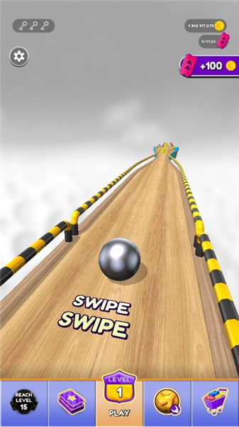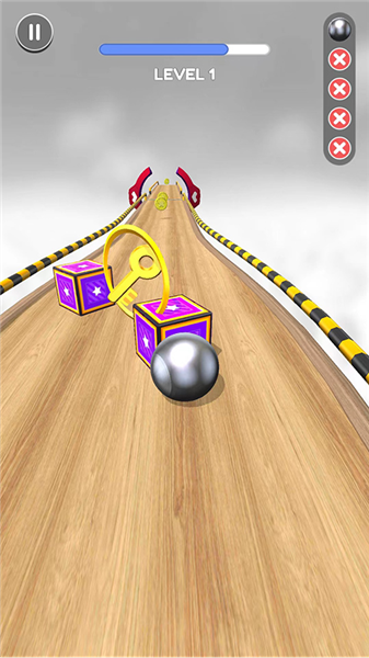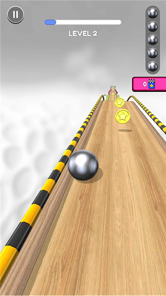 玩家通过滑动屏幕控制球体移动,滑动速度与球的前进速度直接相关。向左滑动球向左前方滚动,向右滑动则向右前方滚动。在两边无围栏或遇到障碍物时需减速,避免掉出通道浪费机会。