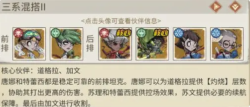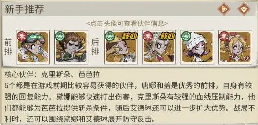 介绍:这6个都是在游戏前期比较容易获得的伙伴,唐娜和盖是优秀的前排,自身有较强的回复能力。黛娜能够快速打出伤害,克里斯朵有较强的血线压制能力,他们都能够为芭芭拉提供斩杀条件,随后艾德琳还可以进一步扩大优势。战局不利时,还可以围绕黛娜和艾德琳展开防守反击。