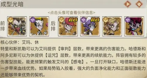 特里和斯凯勒可以为艾玛提供【审判】层数,带来更高的伤害能力。哈德斯和阿多尼斯可以为休提供【诅咒】层数,带来更高的续航能力。阵容拥有较多的伤害型技能,能更频繁的触发艾玛的【感电】。一旦打开缺口,哈德斯还能进一步带来血线优势。如果局势陷入胶着,强大的负面净化能力和正面驱散能力还能够带来优势的契机。