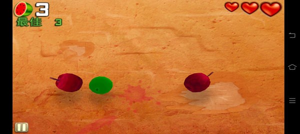 原有的三个红叉被替换为“靴猫”的三滴血,每掉落一个水果就会失去一滴血,挑战更具紧迫感。