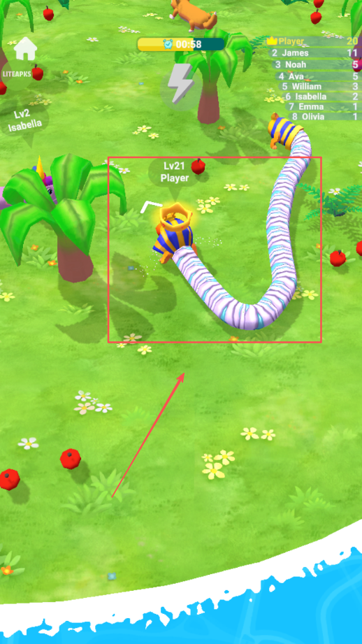 2、控制蛇身移动吃取苹果避开障碍物和其他玩家危险,掌握移动技巧和策略应用方法提升效率。
