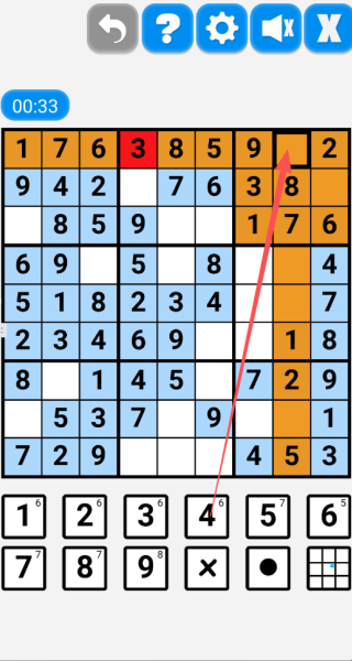 2、下方每个方格里的小数字,代表当前该数字在相应行、列或小九宫格中已经出现的次数,帮助你判断是否重复。