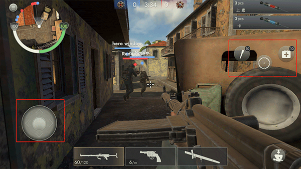 3、游戏开始后,左下角遥感操控角色的移动,右边控制方向、射击、治疗、等操作