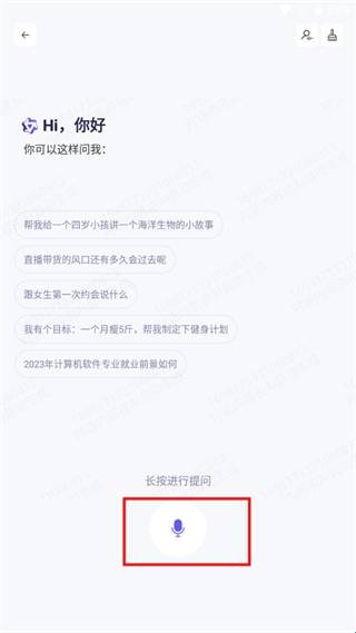4、在不方便打字的情况下,用户可以在右上角“更多”图标中,选择“语音对话”,长按“话筒”图标即可和AI进行对话;