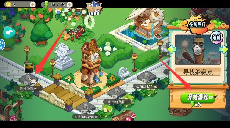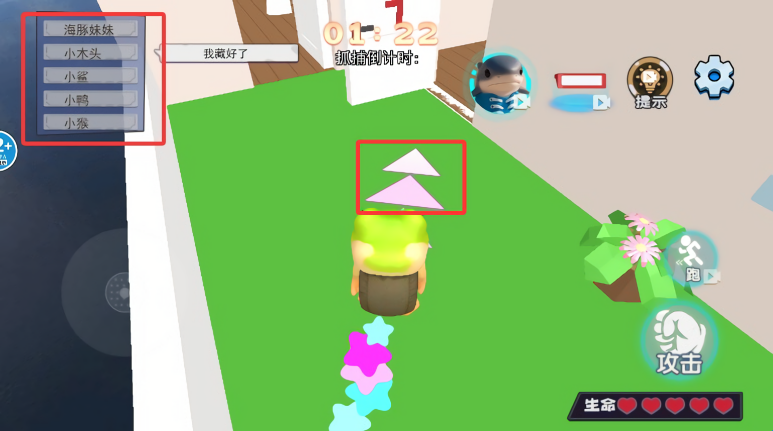 4、根据场景中的箭头提示寻找目标,进行抓捕隐藏角色即可获得积分奖励。