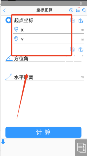 1、坐标计算操作,打开坐标计算功能,依次输入起点的已知坐标、方位角与水平距离,点击计算即可快速获得终点的精确坐标数据。