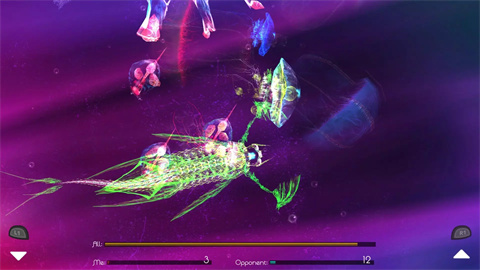 1、玩家操控的单细胞生物需吞噬红、蓝、绿三色微型生物获取能量来进化。
