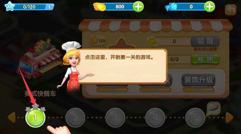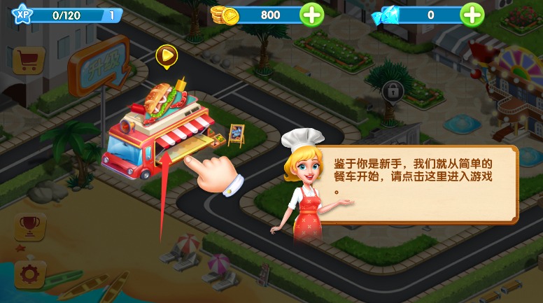1、启动游戏后点击餐车图标按钮,即可正式开启你的美食创业经营模拟之旅。