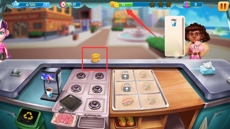 4、点击收取餐费并关注营业额进度条,达成目标金额即可成功通过本关挑战。