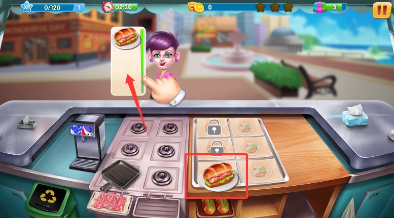 3、根据顾客头顶气泡需求制作对应美食,完成后将餐品拖拽至顾客手中完成交付。