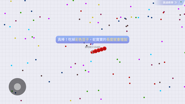 1、控制摇杆走位你的小蛇,吃掉地图上彩色的小圆点,就会变长。