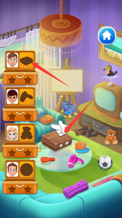 2、将各类所需物品准确拖拽至对应行李箱内,有序整理全家人出行携带的行李。