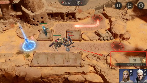 在战斗中拖拽英雄的图标至目标地点即可上阵对应英雄。不同英雄可上阵的地点会受到英雄特性与地图条件而变化,每名英雄都拥有自己的攻击范围。我们可以通过改变放置时的英雄朝向,来尽可能多地利用英雄的攻击范围空间。
