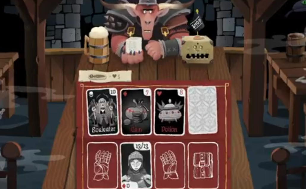想要获取游戏胜利,你必须清空对手的所有地牢卡牌,其中牌堆高度反映剩余卡牌数量。