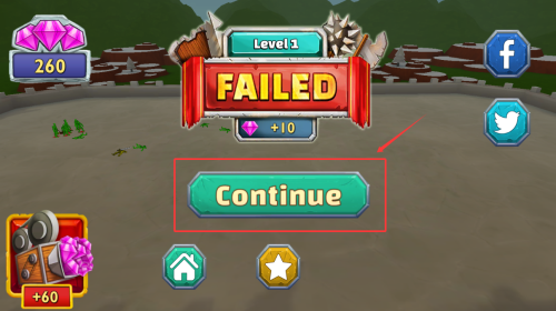 1、点击继续按钮,确认关卡失败并获得十钻石奖励。