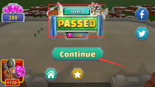 3、点击继续按钮,确认关卡通过并获得二十积分奖励。