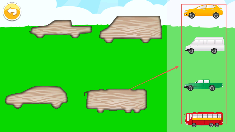 1、车辆匹配玩法需要孩子将正确的车型拖放到场景中对应的位置,有效锻炼观察辨识能力和手眼协调能力,提升反应速度。