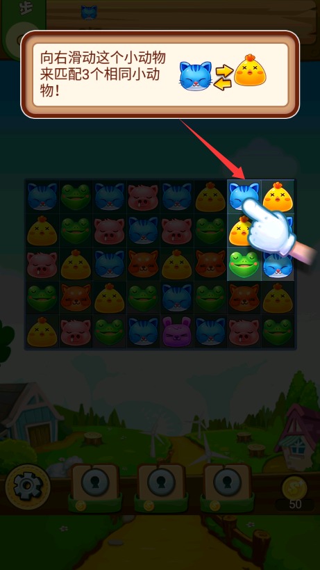 3、通过滑动屏幕交换相邻动物位置,将三个及以上相同动物连成一线消除。