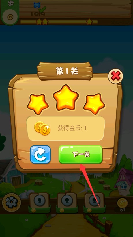 4、成功完成消除目标即可通过关卡,获得金币奖励并点击下一关继续挑战。