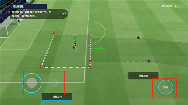 5、接下来开展带球训练,操作方法为:左边拨动摇杆,同时右边点击加速按钮,如此球员便会带球加速。