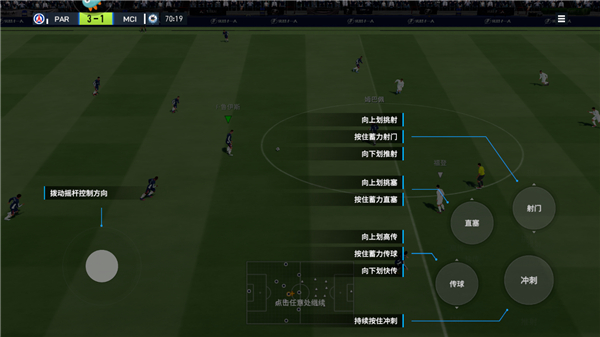 3、操作时,按下虚拟摇杆来控制方向,同时按住右边的射门按钮,即可实现进球。