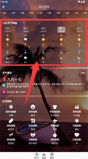 4、具有生活建议服务,根据你所在的城市天气情况,紫外线、穿衣、带伞等建议都有