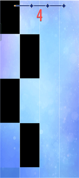 4、进入游戏后,界面会出现四个赛道,每个赛道会随歌曲的乐谱出现黑色的钢琴键,从上向下移动,点击黑色的钢琴键就会发出音符的声音,连续点击成功,音乐就会流畅的播放出来;