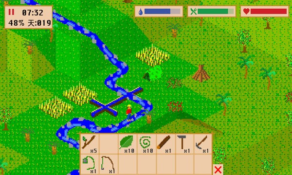 1、游戏画面复古,结构简单,但基本的荒岛生存玩法都比较有趣:探索、采集、简单的组装道具;