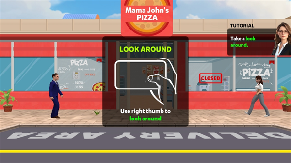 玩家可以按照屏幕上给出的操作步骤,点击移动角色来购买制作披萨,然后把披萨移动到货架;