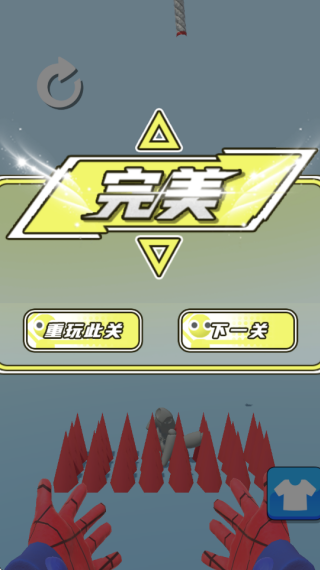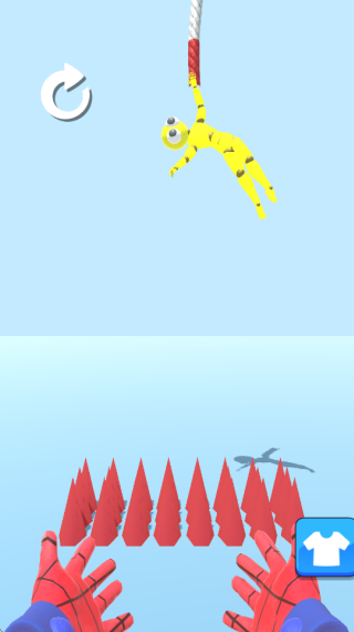 2.玩家的任务是要消灭关卡中的黄色布娃娃机器人。点击屏幕吐出蛛丝,然后向下拉扯,利用尖刺来消灭它吧!