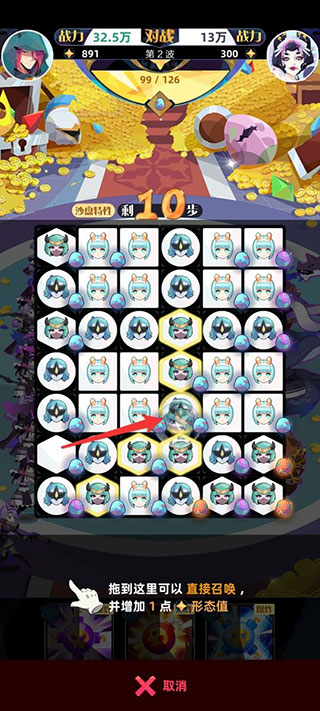 4、技能使用后,观察沙盘分布,先消除底部两侧。如下图移动左侧月斩和中间卡洛互换,消除后会形成大片掉落,可以自动合成掉部分蛋。