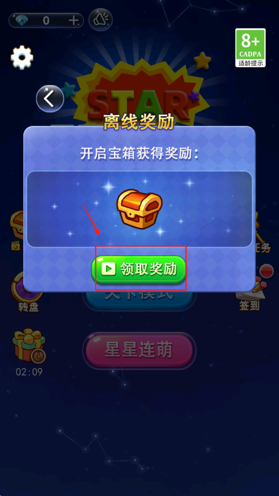 1、点击“领取奖励”按钮,开启宝箱获取离线奖励。