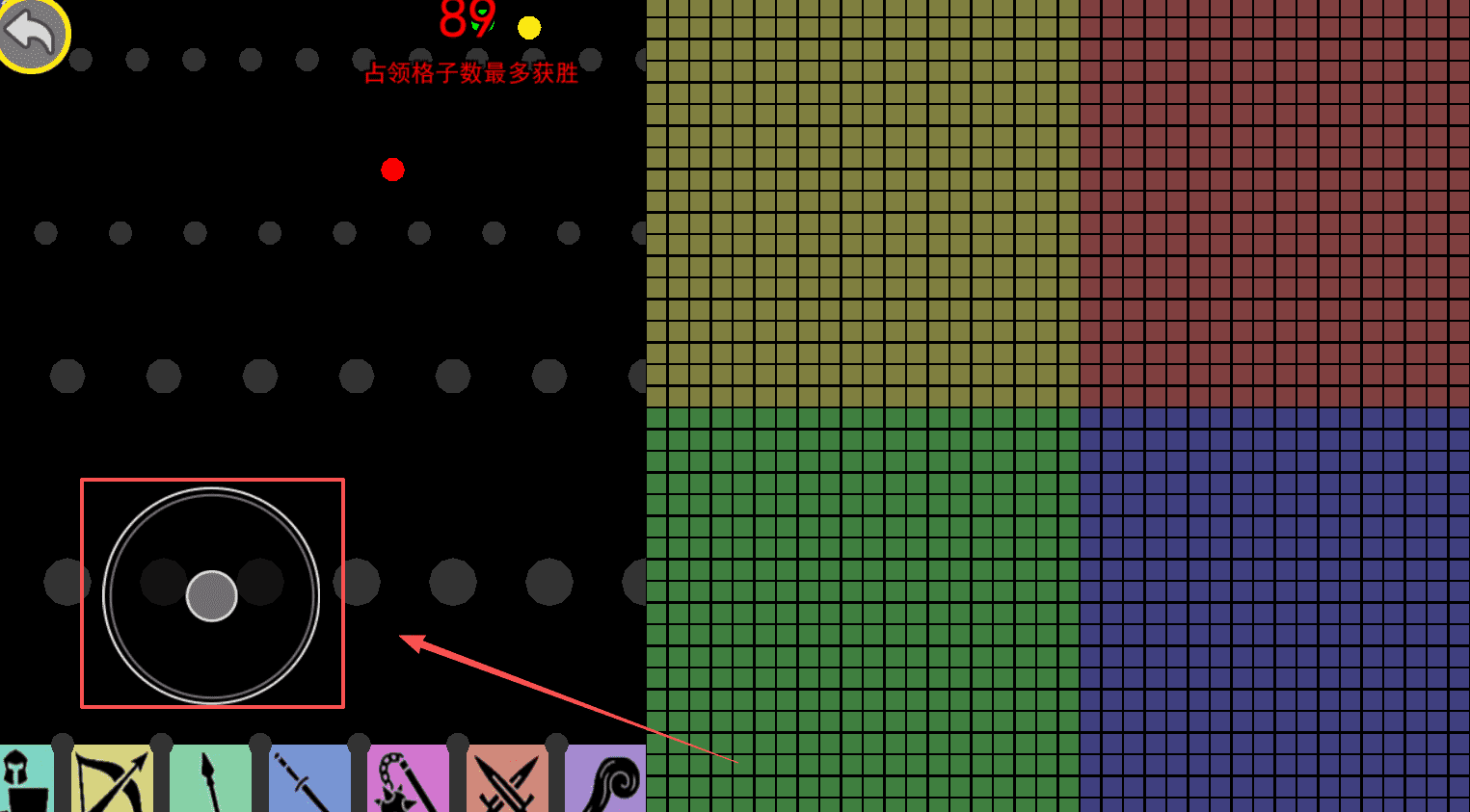 3、通过包围拦截或躲避威胁的方式保护已占区域,并寻找机会切割对手领土逐步提升颜色占比优势。