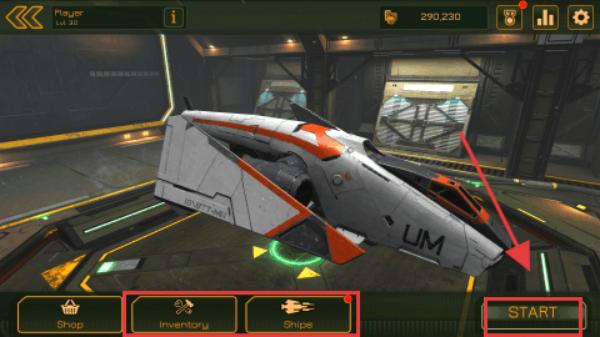 1、打开游戏,点击【Inventory】进入库存可以使用道具、装备等,点击【Ships】切换飞船类别,完成后点击【START】。