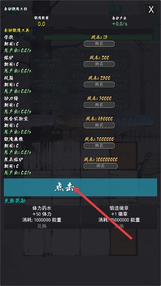 3、在【自动锻造工坊】界面,点击底部【点击】按钮,查看各类自动锻造工具的购买成本,推进工具解锁流程。